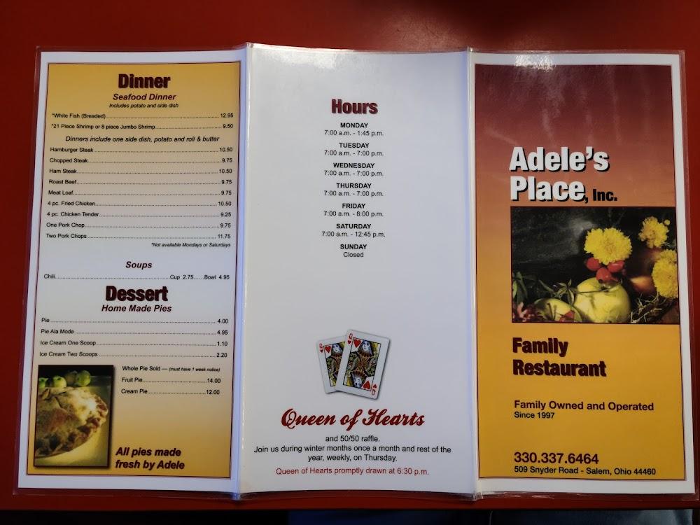 Welcome to Adele's Restaurant, your go-to family-friendly dining destination in Salem, OH! Nestled at 509 Snyder Rd, we pride ourselves on serving a delightful breakfast, lunch, and dinner with a menu featuring local specialties. Enjoy excellent coffee and tempting desserts in our relaxed atmosphere, perfect for solo diners or groups. With convenient amenities like takeout, delivery, and accessible parking, we cater to everyone’s needs. Our commitment to quality is reflected in our vast selection of teas and simple, traditional dishes. Join us for a memorable meal—reservations are welcome!